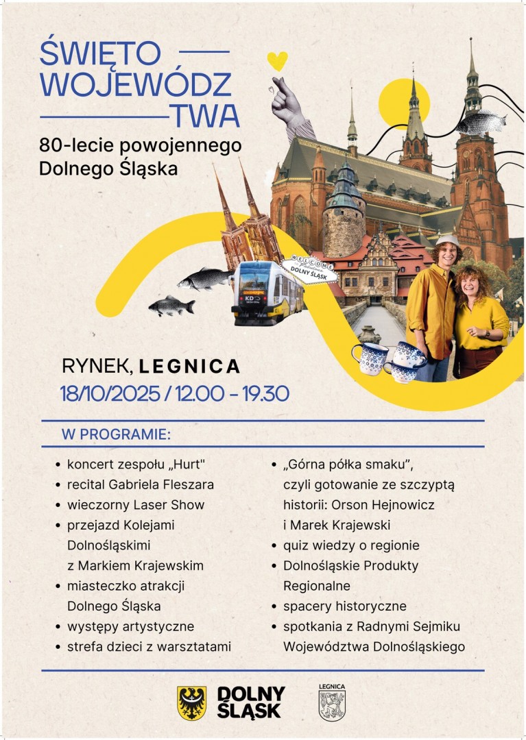 W tym roku Święto Województwa Dolnośląskiego odbędzie się w Legnicy! Miasto zaprasza wszystkich Dolnoślązaków na legnicki Rynek, w sobotę 18 października, gdzie od południa czekać będzie ciekawy program artystyczny oraz strefa atrakcji dla całych rodzin.