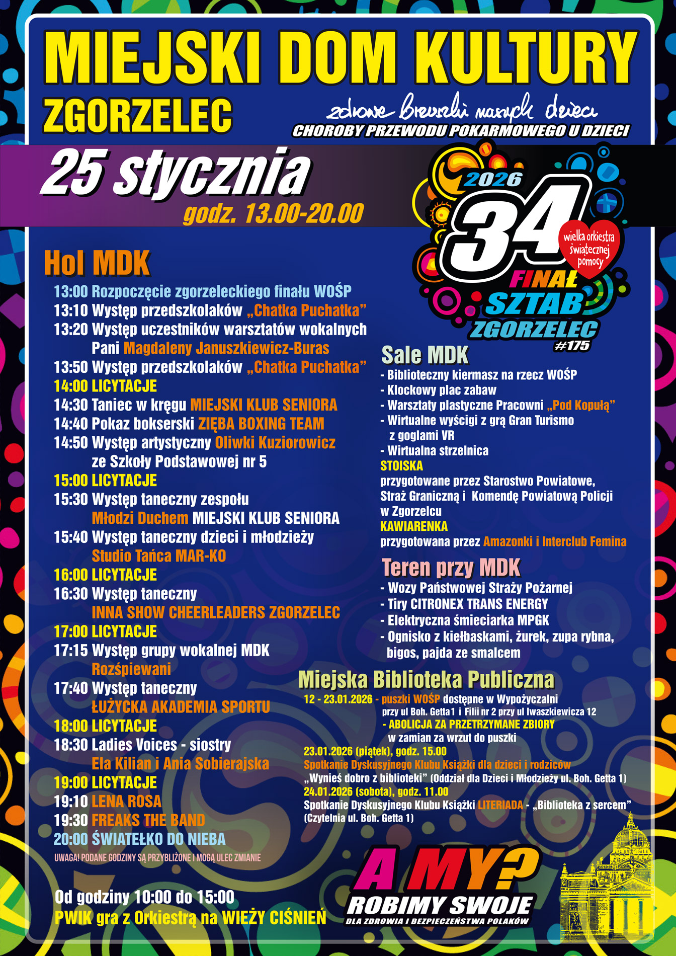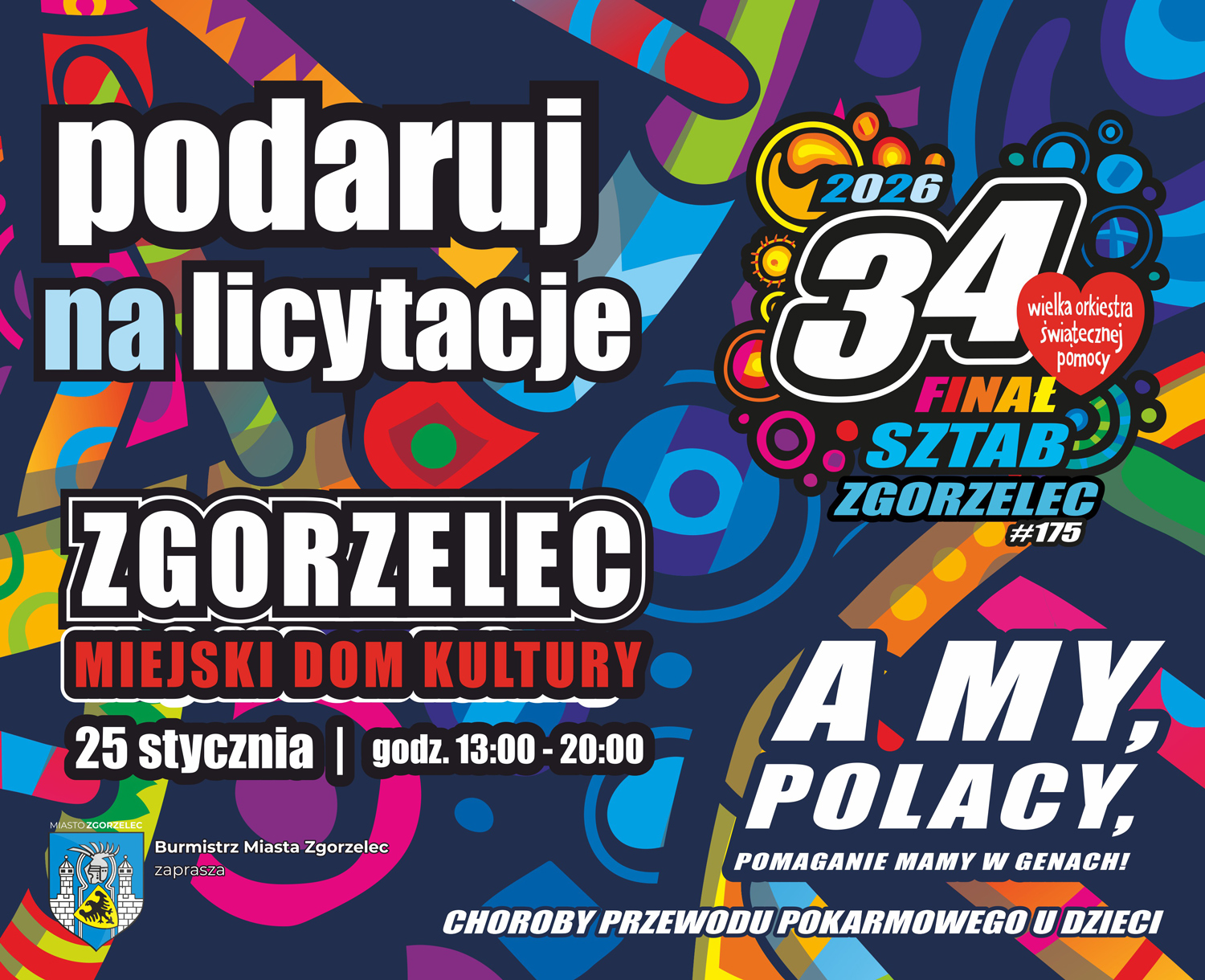 Już 25 stycznia Zgorzelec po raz kolejny zagra razem z Wielką Orkiestrą Świątecznej Pomocy. 34. Finał WOŚP, organizowany przez #175 Sztab WOŚP w Miejskim Domu Kultury w Zgorzelcu, odbędzie się w godzinach od 13:00 do 20:00 i zapowiada się jako prawdziwe święto muzyki, tańca i wspólnego pomagania. W programie nie zabraknie wyjątkowych atrakcji m.in. Koncertu Kolęd Zgorzeleckiej Orkiestry Mandolinistów, okazji do podziwiania panoramy miasta z wieży ciśnień PWiK oraz licznych wydarzeń przygotowanych przez Miejską Bibliotekę Publiczną.