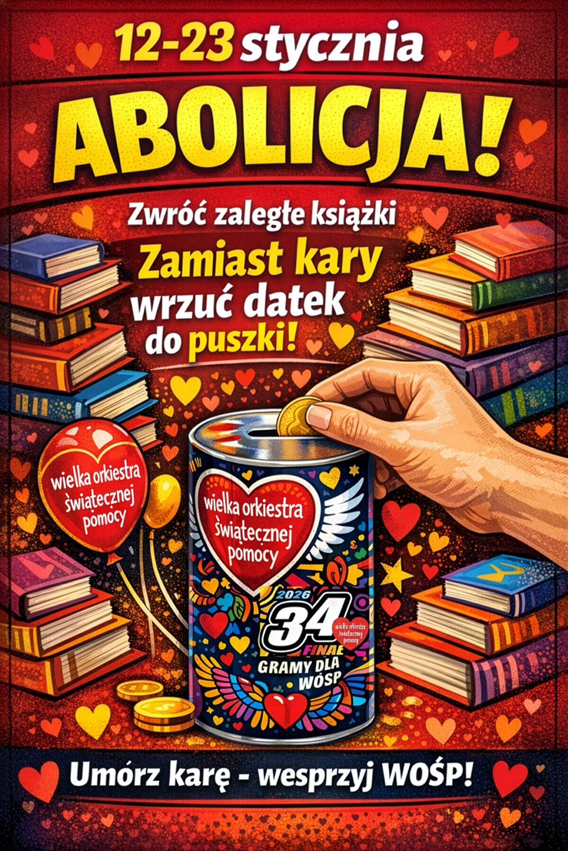 Od 12 do 23 stycznia puszki WOŚP dostępne są w Miejskiej Bibliotece Publicznej przy ul. Boh. Getta 1 oraz w filii przy ul. Iwaszkiewicza 1. W tym czasie obowiązuje abolicja za przetrzymane książki. Zamiast płacić karę, możesz wrzucić datek do puszki WOŚP i wesprzeć 34. Finał Wielkiej Orkiestry Świątecznej Pomocy.