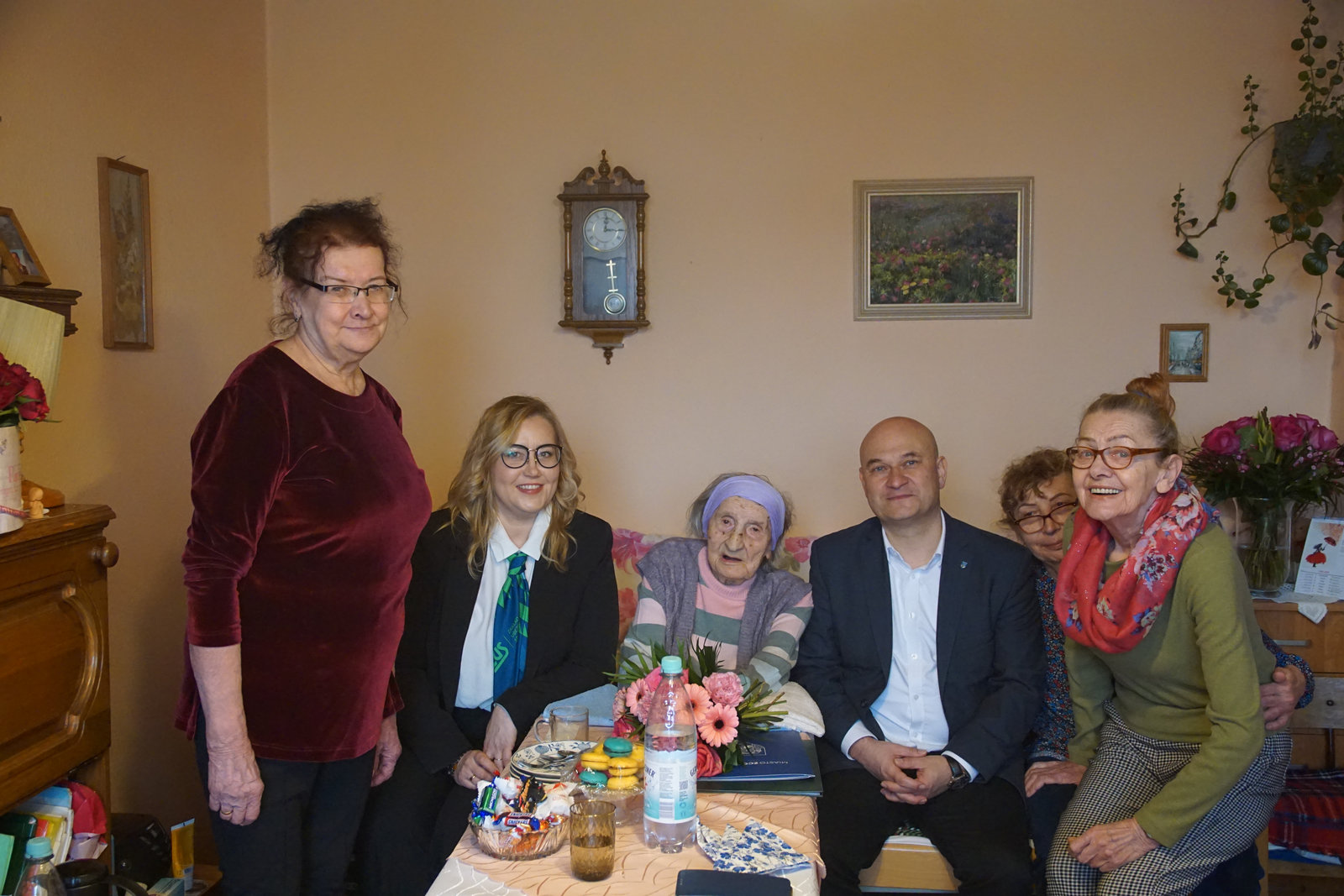 Świętującą w gronie najbliższych Jubilatkę odwiedził Burmistrz Miasta Zgorzelec Rafał Gronicz, który życzył zacnej Solenizantce zdrowia, pogody ducha, radości i spokoju na dalsze lata życia oraz wręczył list gratulacyjny, bukiet kwiatów i kosz upominkowy.