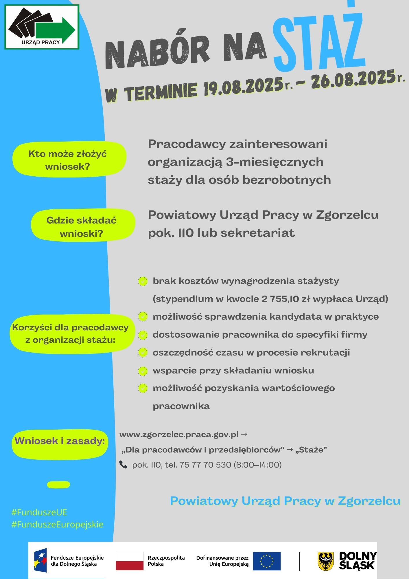 Powiatowy Urząd Pracy w Zgorzelcu ogłasza nabór wniosków na organizację 3-miesięcznych staży dla osób bezrobotnych. Dokumenty można składać w terminie od 19 do 26 sierpnia 2025 r.