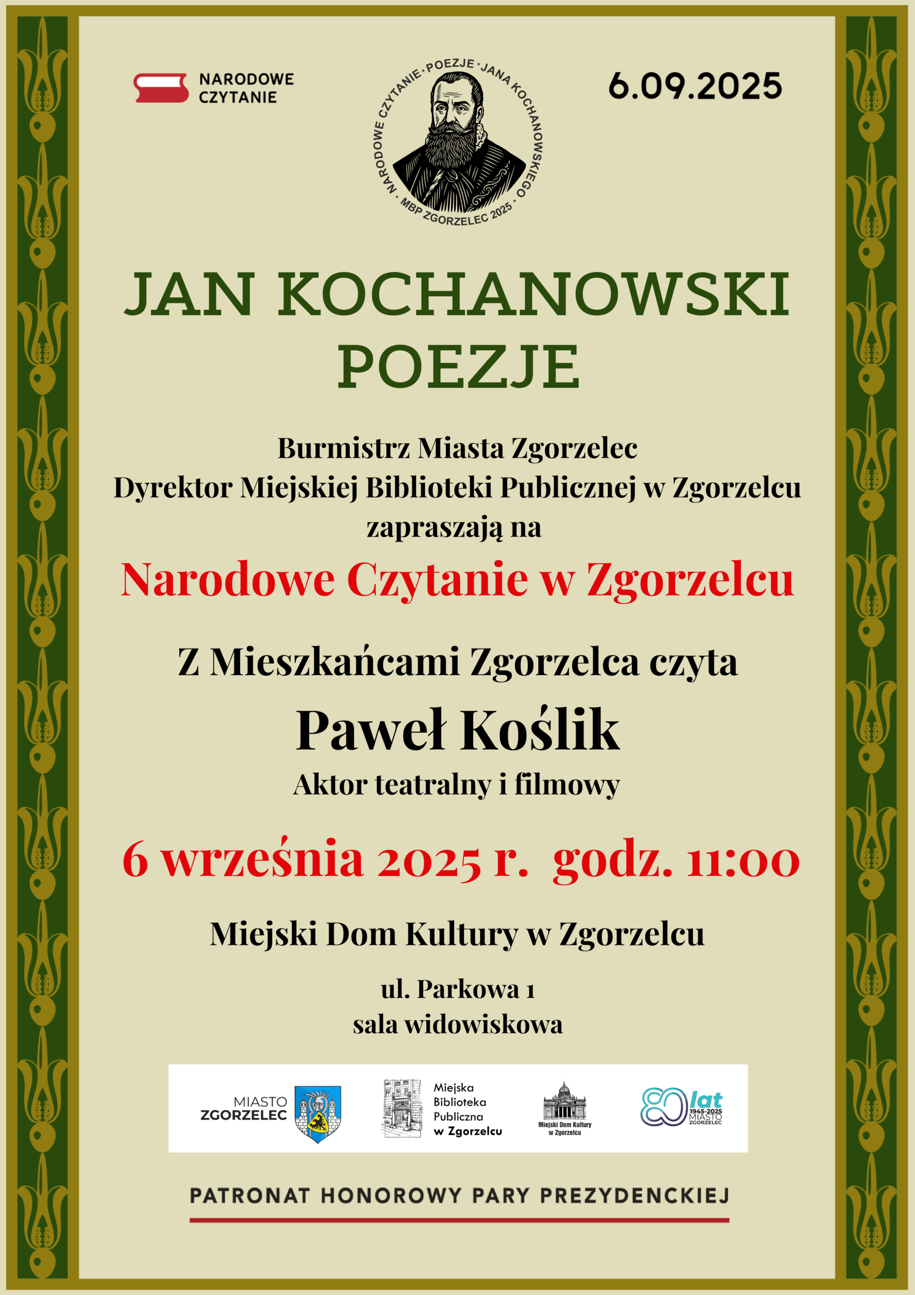 Burmistrz Miasta Zgorzelec i Dyrektor Miejskiej Biblioteki Publicznej w Zgorzelcu zapraszają do udziału w Narodowym Czytaniu 2025. Tegoroczne Zgorzeleckie Narodowe Czytanie odbędzie się 6 września (sobota) o godz. 11:00 w Miejskim Domu Kultury w Zgorzelcu.