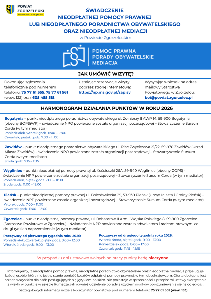 W Zgorzelcu punkt nieodpłatnej pomocy prawnej znajduje się przy ul. Bohaterów II Armii Wojska Polskiego 8 (Starostwo Powiatowe) – świadczenie NPP powierzone zostało adwokatom i radcom prawnym, co drugi tydzień naprzemiennie (w tym mediator).