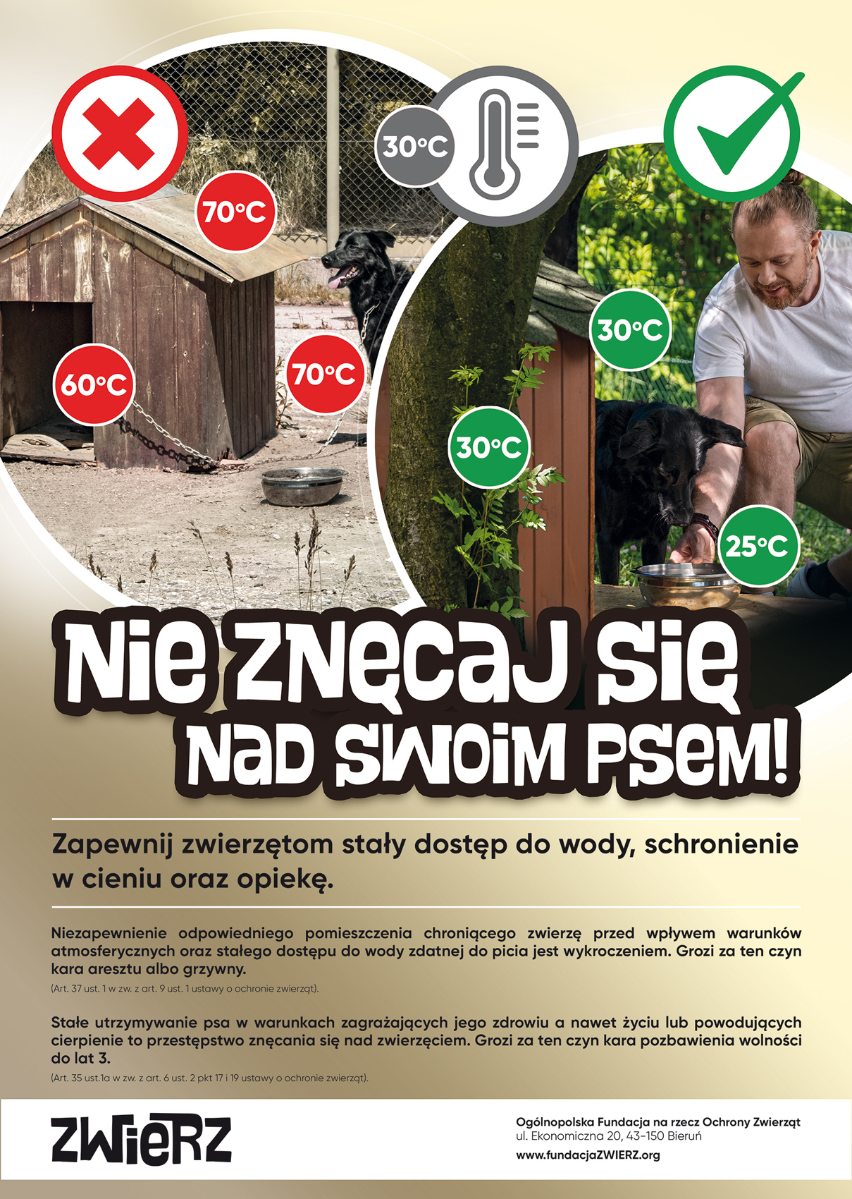 Lato to wyzwanie dla zwierząt. Podczas upałów narażone są na liczne poparzenia, odwodnienie, udary, a nawet na utratę życia. Szczególnie w trudnych warunkach są zwierzęta żyjące na uwięzi, pozostawione same sobie, często bez kropli wody zdatnej do picia. Buda, która stoi na otwartym słońcu i jest pokryta blachą, nagrzewa się i temperatura w środku sięga nawet 70*C. Metalowy łańcuch rozgrzewa się do podobnych temperatur i może powodować poparzenia na skórze zwierzęcia.