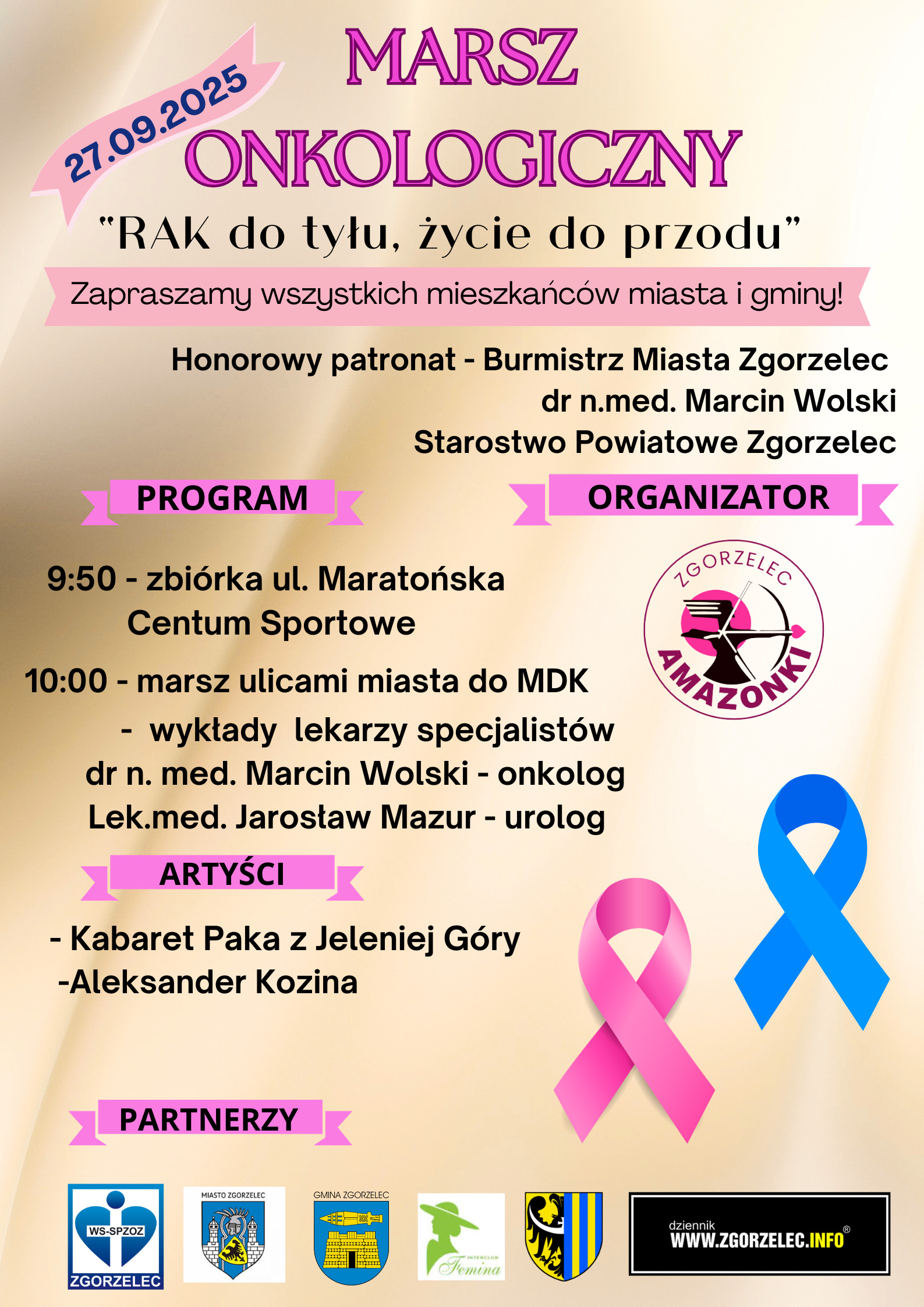 Serdecznie zapraszamy do udziału w V Marszu Amazonek w Zgorzelcu, który odbędzie się 27 września 2025 r. Startujemy o godzinie 10:00 spod Centrum Sportowo Rekreacyjnego przy ul. Maratońskiej. Przemarsz ulicami miasta zakończymy przy Miejskim Domu Kultury.