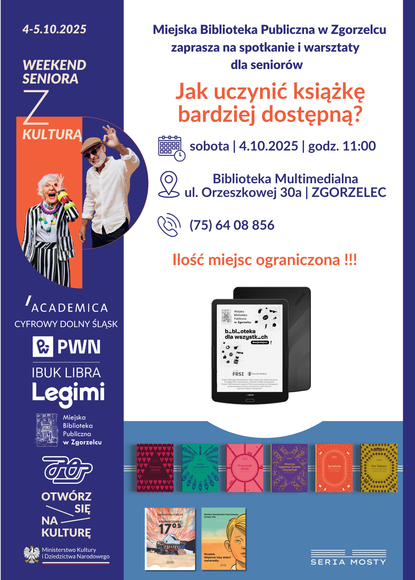 Miejska Biblioteka Publiczna w Zgorzelcu serdecznie zaprasza seniorów na spotkanie pt. „Jak uczynić książkę bardziej dostępną?”, które odbędzie się 4 października 2025 r. o godz. 11:00 w Filii nr 1 MBP, ul. Orzeszkowej 30a. To świetna okazja, by dowiedzieć się jak ułatwić sobie i innym korzystanie z książek i poznać nowoczesne technologie czytelnicze.