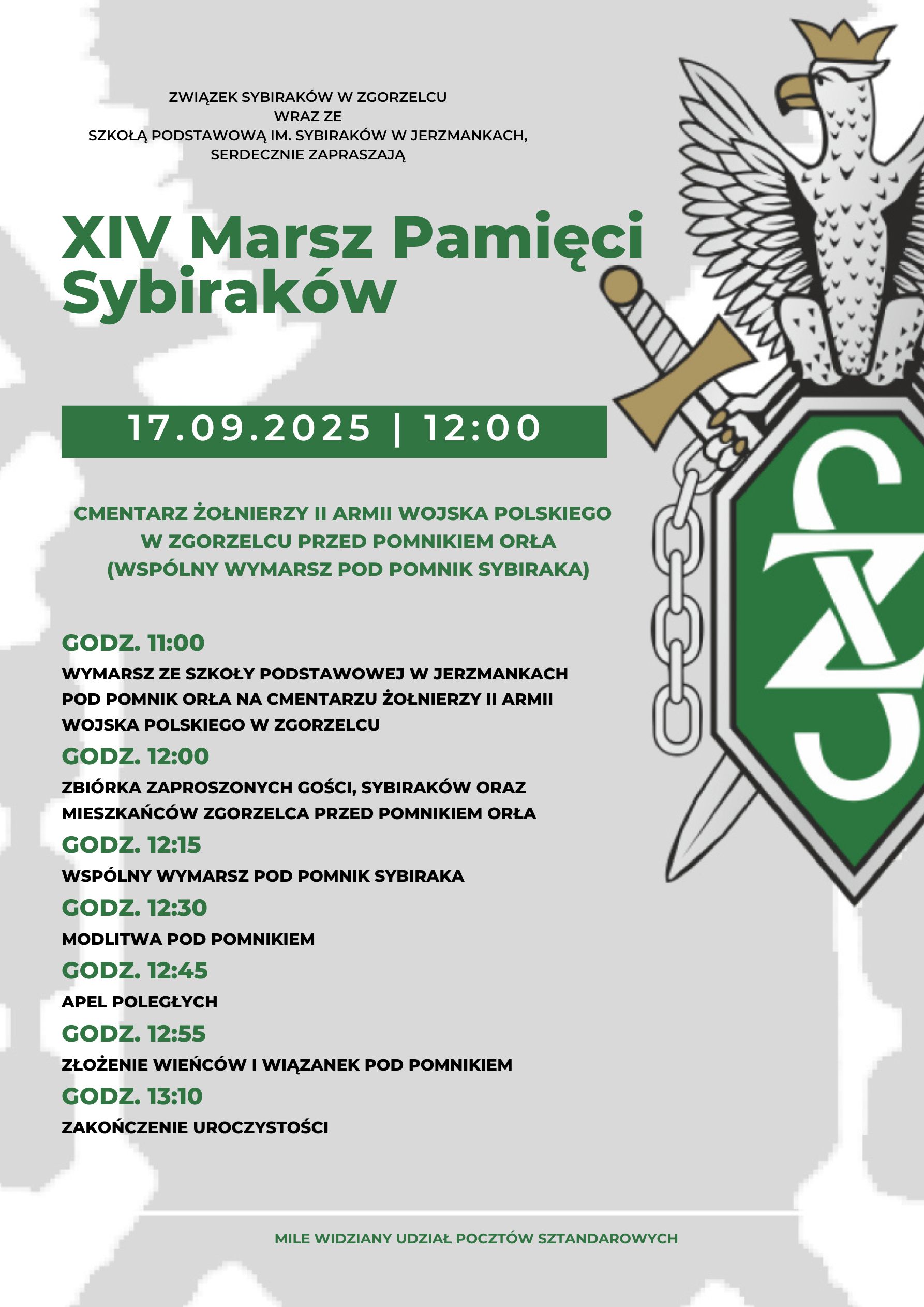 Związek Sybiraków w Zgorzelcu wraz ze Szkołą Podstawową im. Sybiraków w Jerzmankach serdecznie zapraszają do udziału w XIV Marszu Pamięci Sybiraków, organizowanym z okazji „Dnia Sybiraka”. Uroczystość odbędzie się 17 września 2025 r. o godz. 12:00 na Cmentarzu Żołnierzy II Armii Wojska Polskiego w Zgorzelcu, przed Pomnikiem Orła.