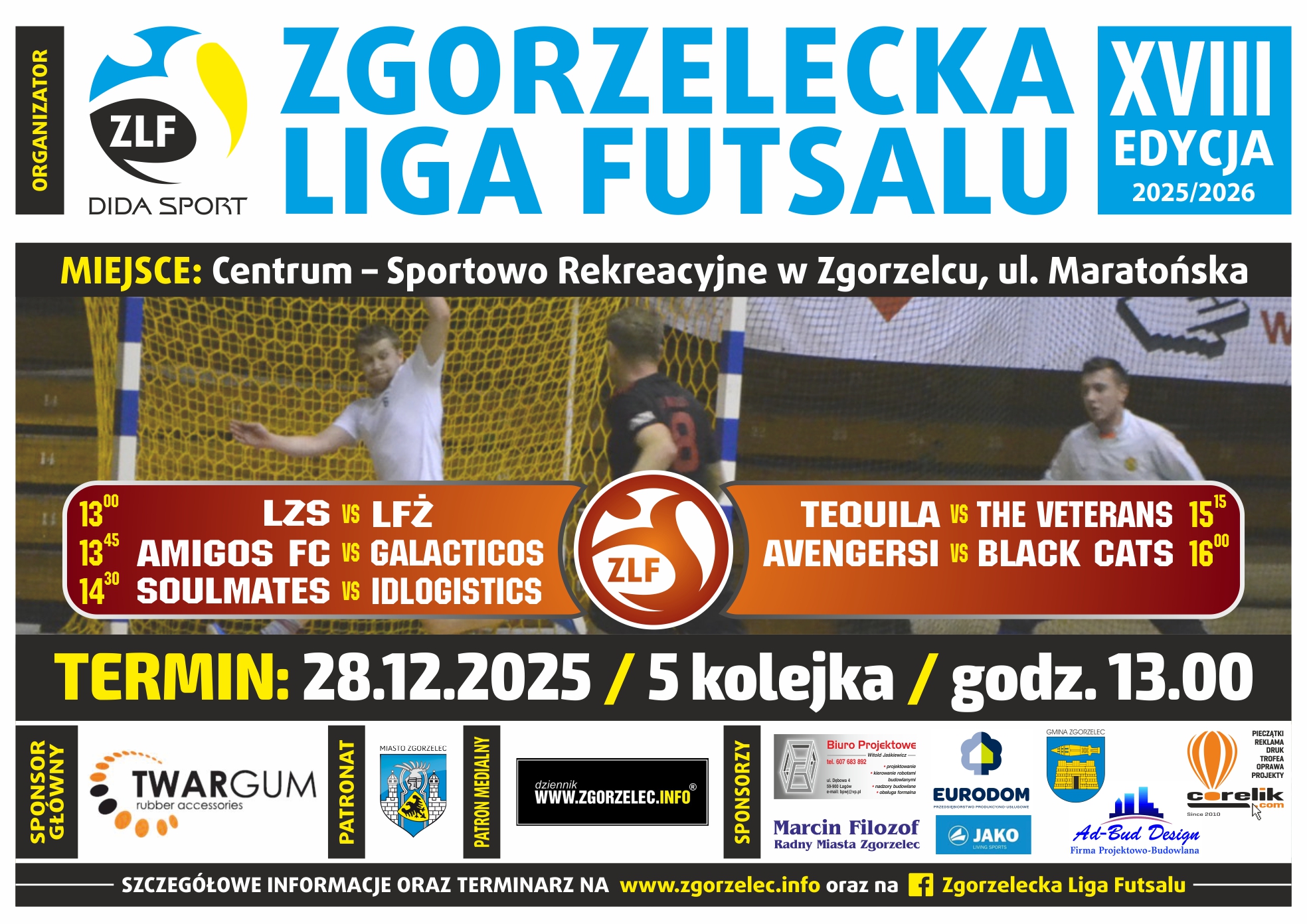 W niedzielę 28 grudnia w hali CSR w Zgorzelcu przy ul. Maratońskiej rozegrana zostanie V kolejka XVIII edycji Zgorzeleckiej Ligi Futsalu o Puchar Burmistrza Miasta Zgorzelec. Początek spotkań zaplanowano na godzinę 13:00.