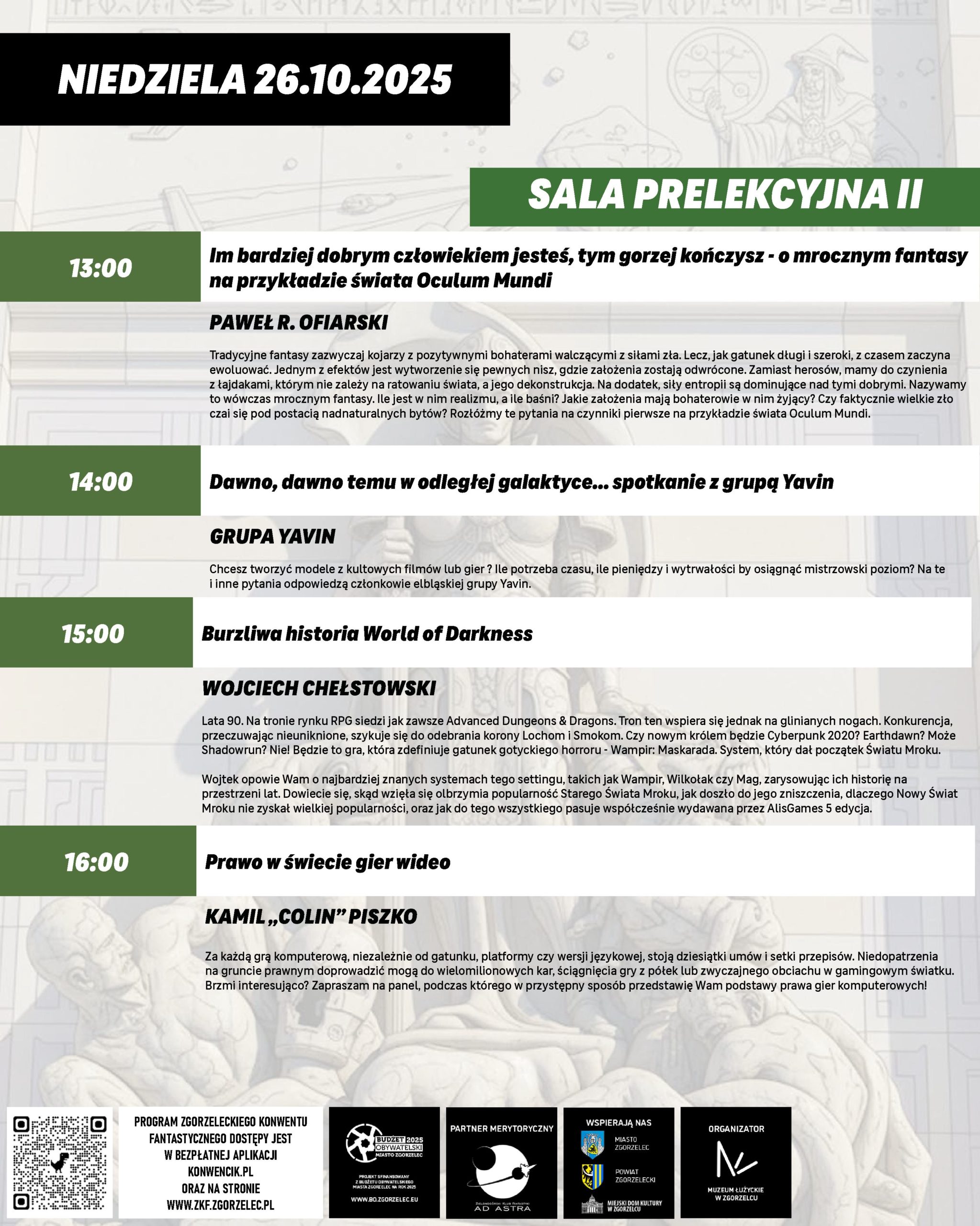 1. „Im bardziej dobrym człowiekiem jesteś, tym gorzej kończysz – o mrocznym fantasy na przykładzie świata Oculum Mundi” | Godzina: 13:00 | Prowadzący: Paweł R. Ofiarski