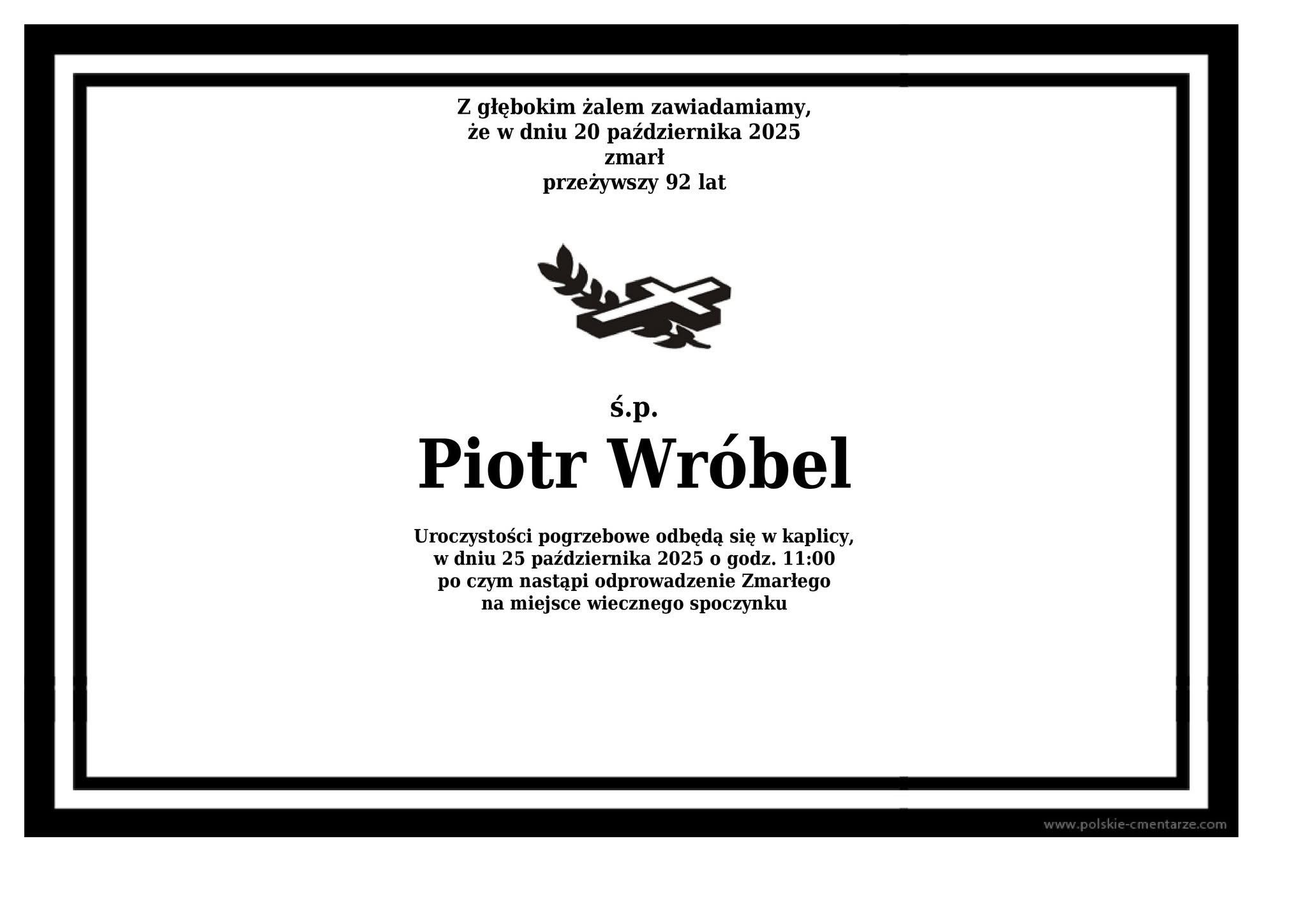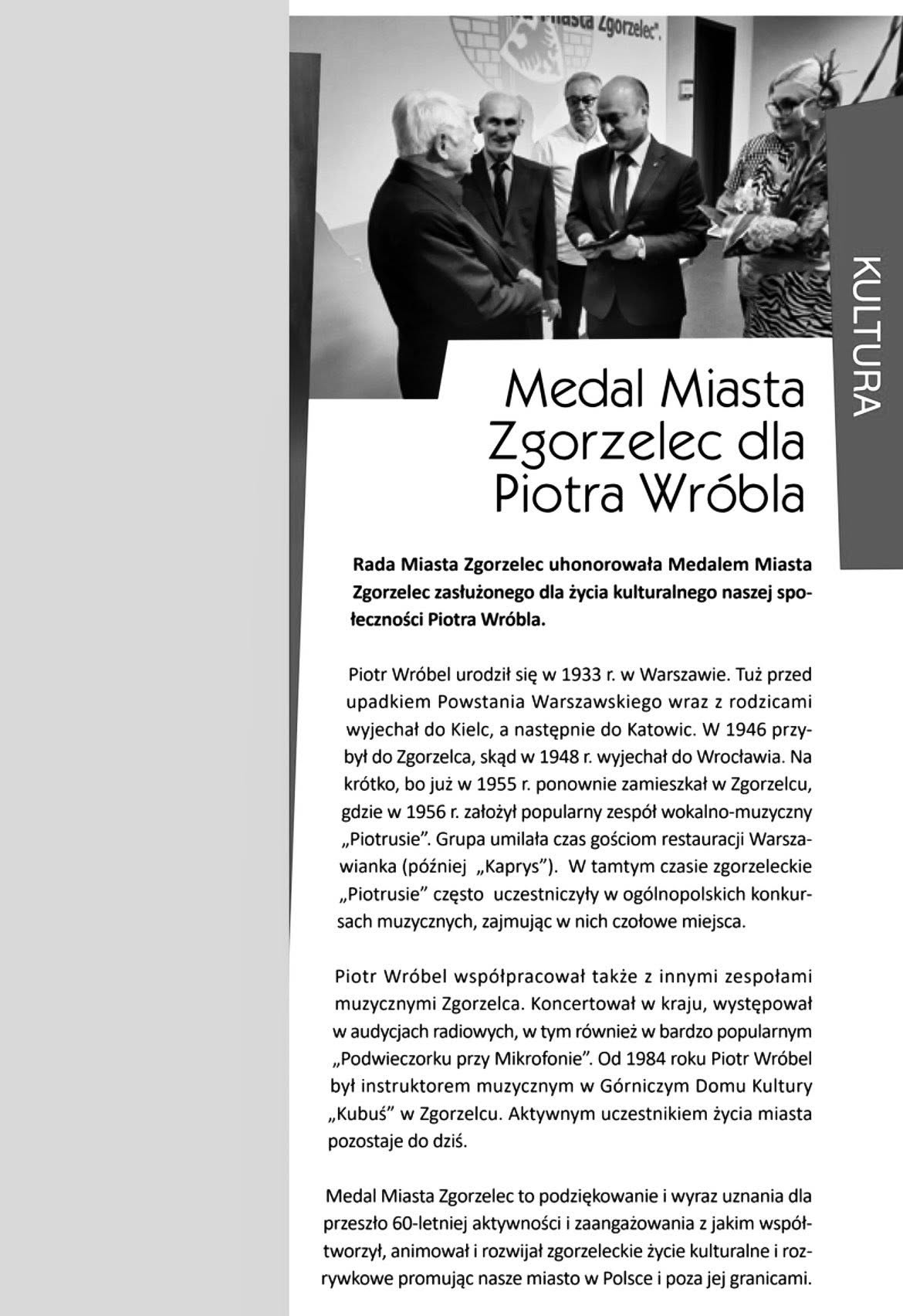 Z głębokim smutkiem informujemy, że 20 października 2025 roku odszedł Piotr Wróbel – wyróżniony Medalem Miasta Zgorzelec, pianista, kompozytor, autor tekstów piosenek, założyciel zespołu wokalno-muzycznego „Piotrusie”, wieloletni pracownik Górniczego Domu Kultury „Kubuś” oraz muzyk orkiestry kopalni „Turów”. Był przede wszystkim niezwykle serdecznym człowiekiem – mężem, ojcem, dziadkiem i przyjacielem.