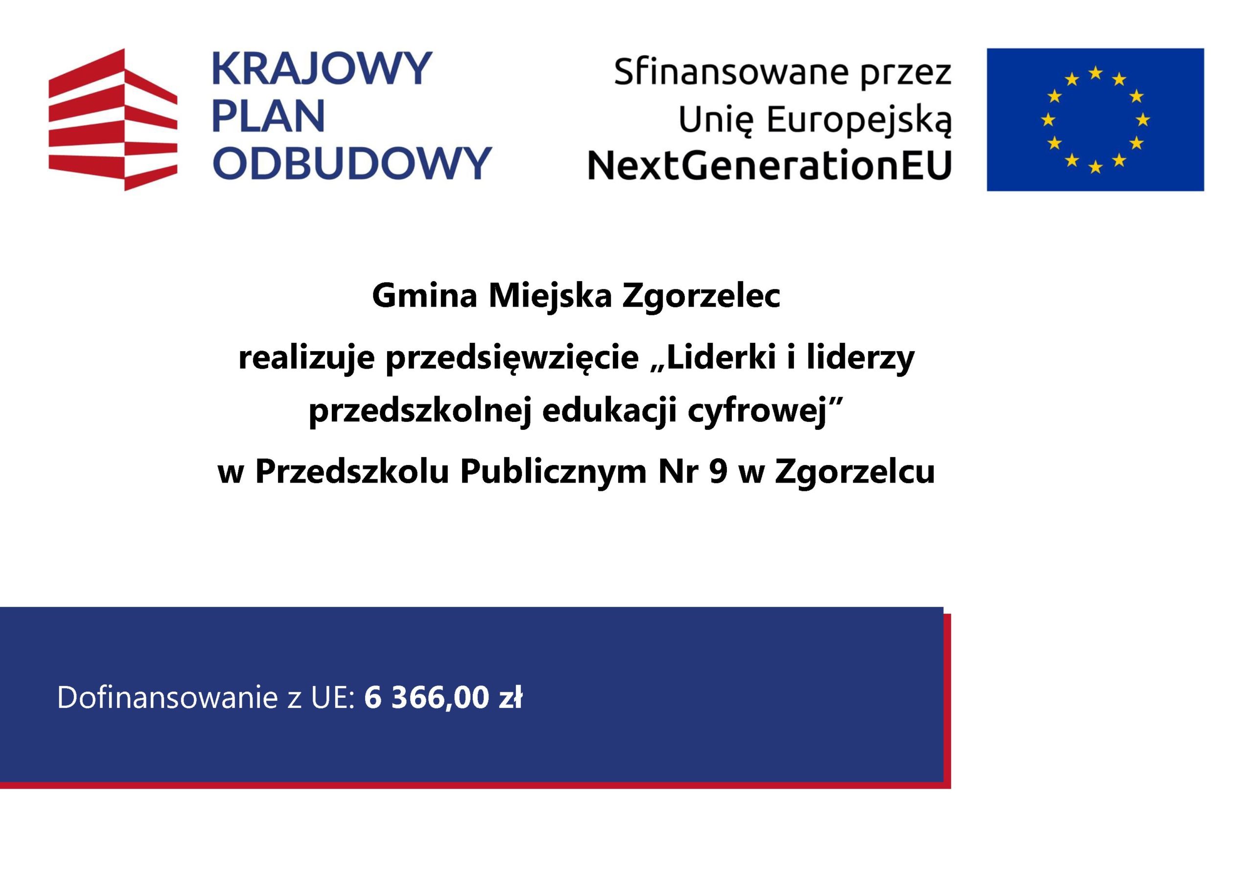 Gmina Miejska Zgorzelec otrzymała grant na zakup cyfrowych materiałów dydaktycznych w ramach przedsięwzięcia „Liderki i liderzy przedszkolnej edukacji cyfrowej” finansowanego ze środków UE – Instrumentu na Rzecz Odbudowy i Zwiększania Odporności, w ramach Krajowego Planu Odbudowy – Reforma: C2.1: Zwiększenie skali zastosowań rozwiązań cyfrowych w sferze publicznej, gospodarce i społeczeństwie, Inwestycja C2.1.3: E-kompetencje.