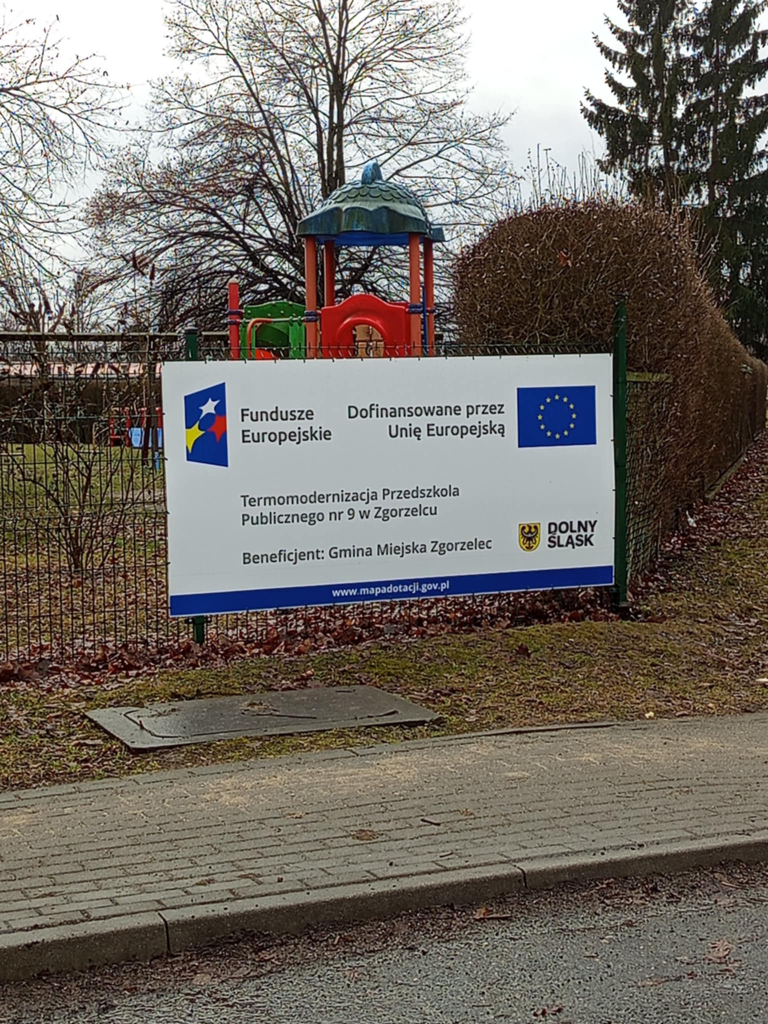 26 września 2025 r. Burmistrz Miasta Zgorzelec podpisał umowę o dofinansowanie ze środków Europejskiego Funduszu Rozwoju Regionalnego w ramach Programu Fundusze Europejskie dla Dolnego Śląska 2021-2027, Priorytetu nr 2 „Fundusze Europejskie na rzecz środowiska na Dolnym Śląsku”, Działania 2.1 „Efektywność energetyczna w budynkach publicznych” projektu pn. „Termomodernizacja Przedszkola Publicznego nr 9 w Zgorzelcu” nr FEDS.02.01-IZ.00-0005/25.